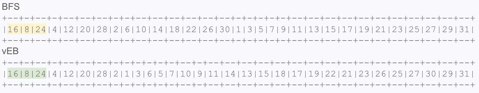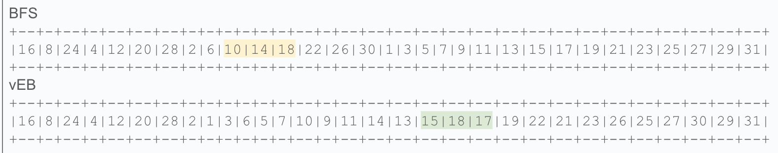 To see this layout is useful, let's compare a search in the tree for the value in node #17 in both vEB layout and the standard breadth first (BFS) layout on a system with am arbitrarily chosen fetch size of 3.