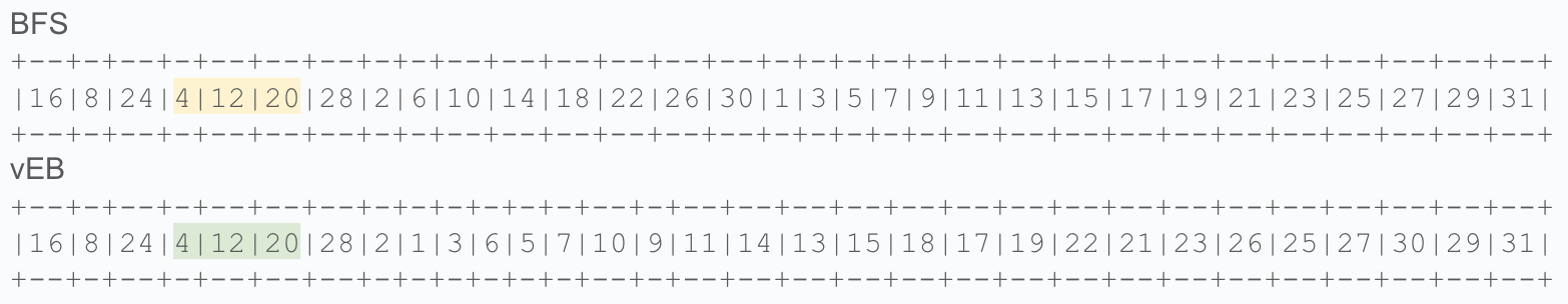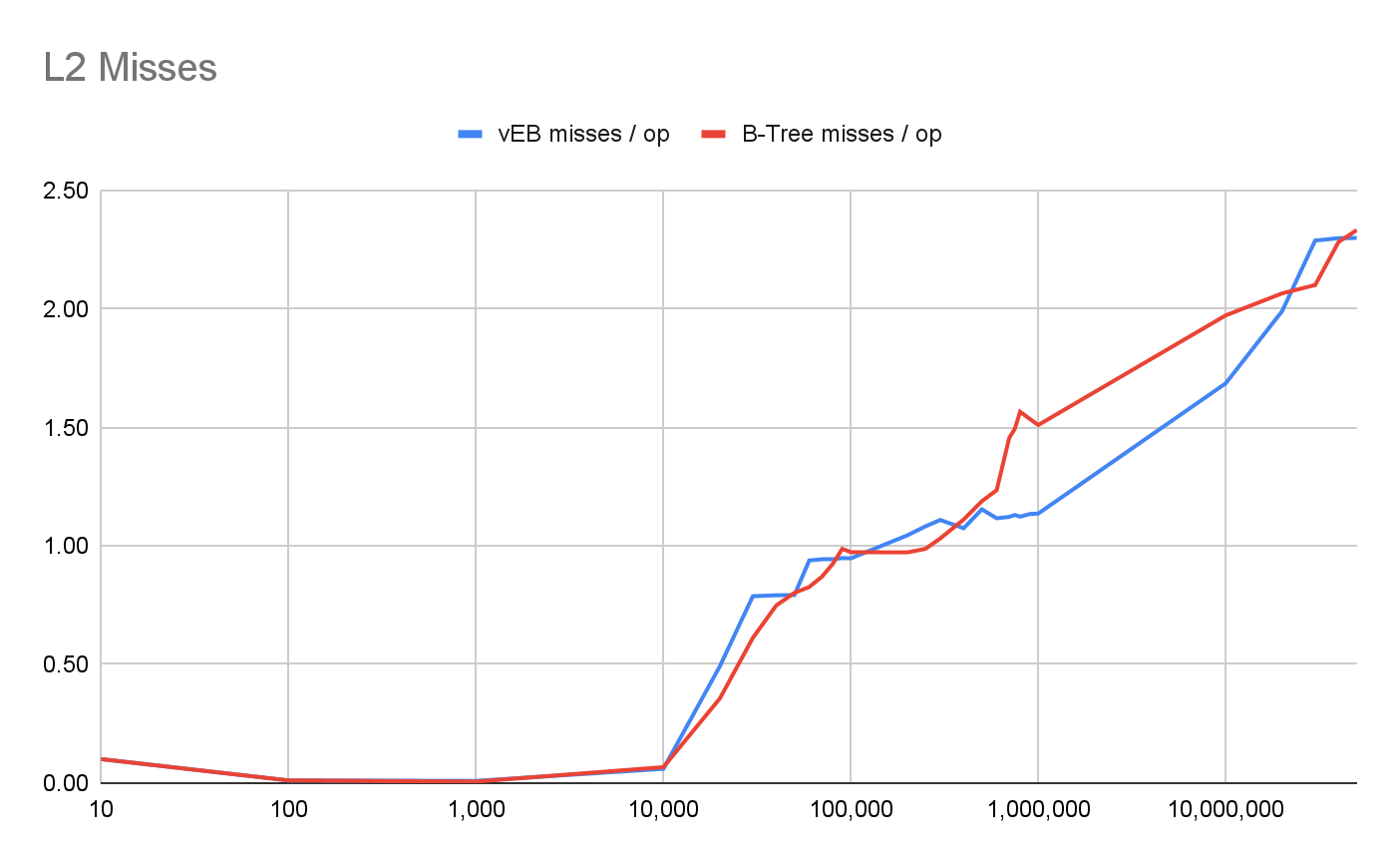 That said, even in the cases where the vEB layout performs better it's not obvious that the complexity is worth the result because it doesn't seem to usually change a workload that incurs misses into one that doesn't; the best cases I've seen the layout reduces a ≈2-miss workload into a ≈single-miss one.