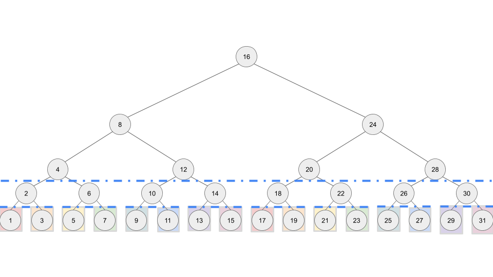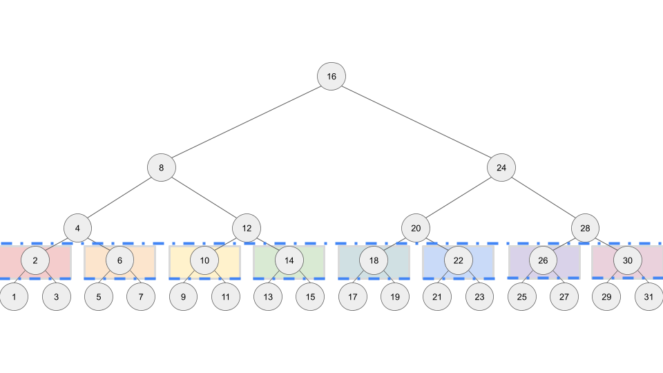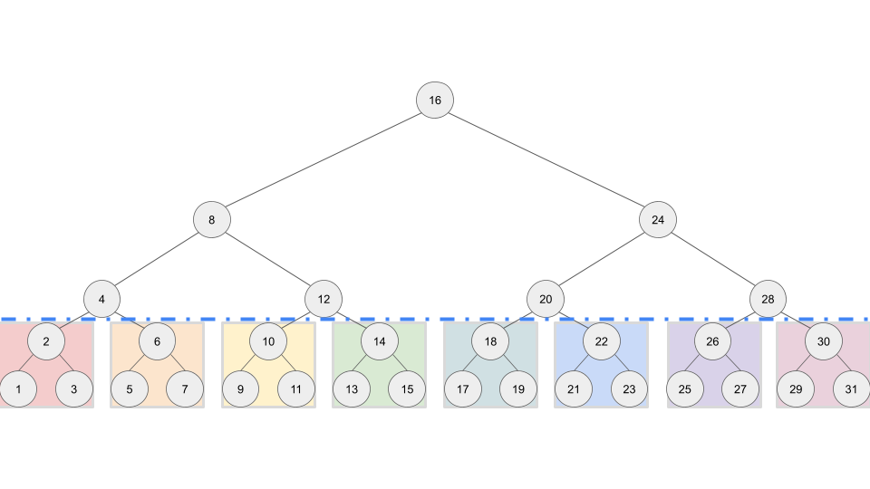 This layout is asymptotically optimal but imperfect. The specific size of the tree determines whether it can be subdivided into optimal chunks, or whether there are inefficient chunks that don't fill the fetch size. For instance our 5 height tree had a bunch of one node chunks in the middle, making reads involving those nodes and its children less efficient.